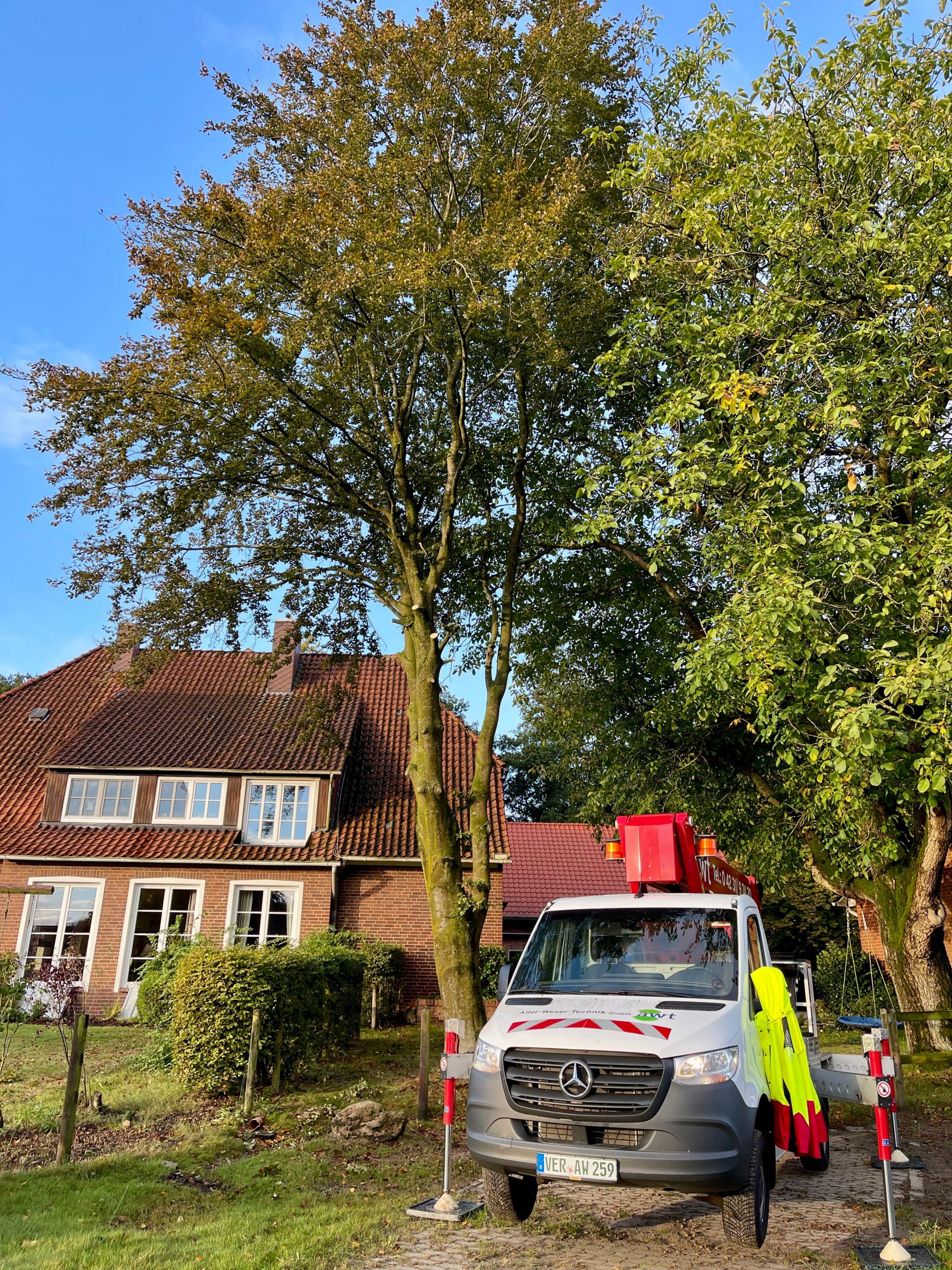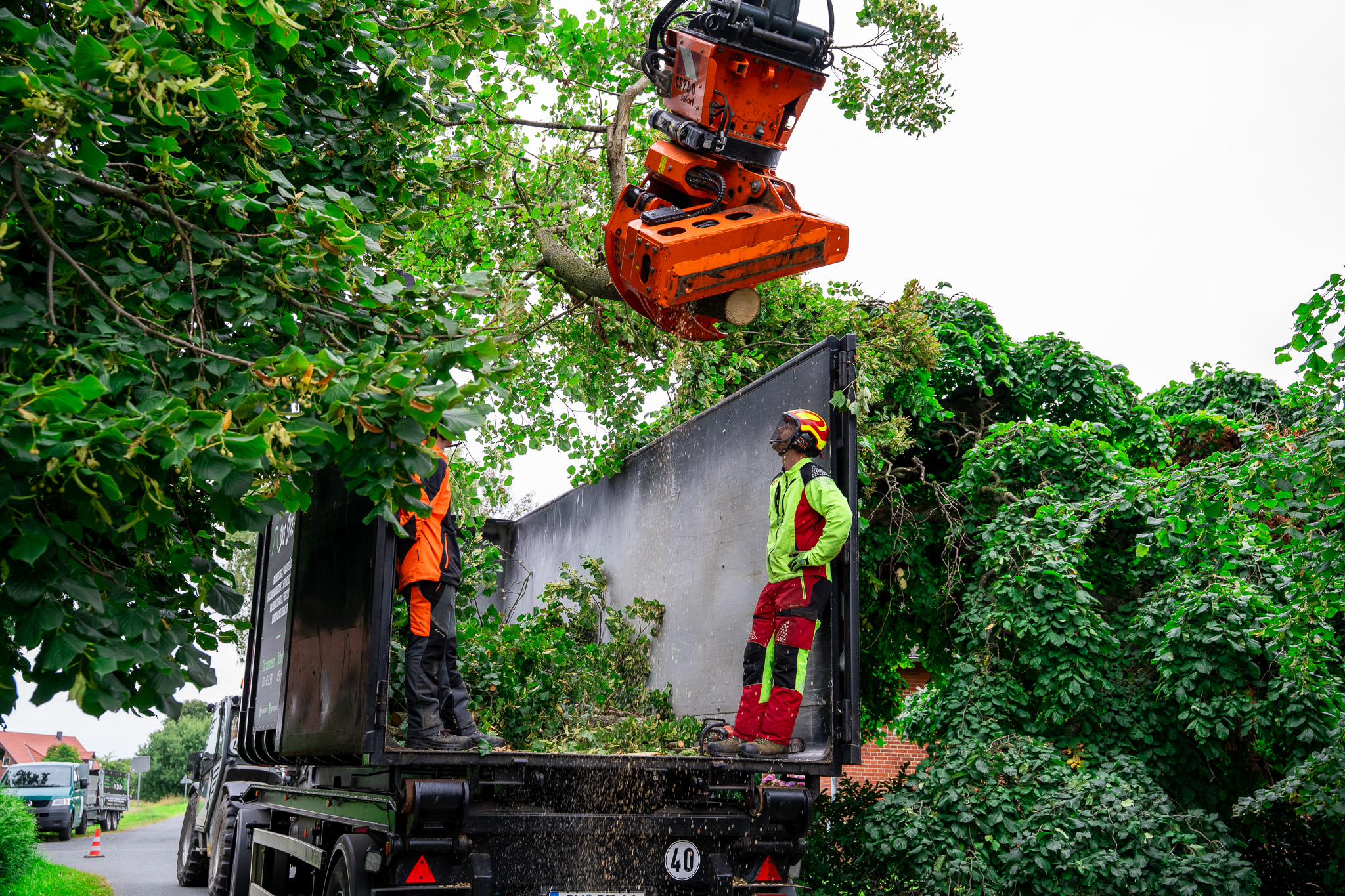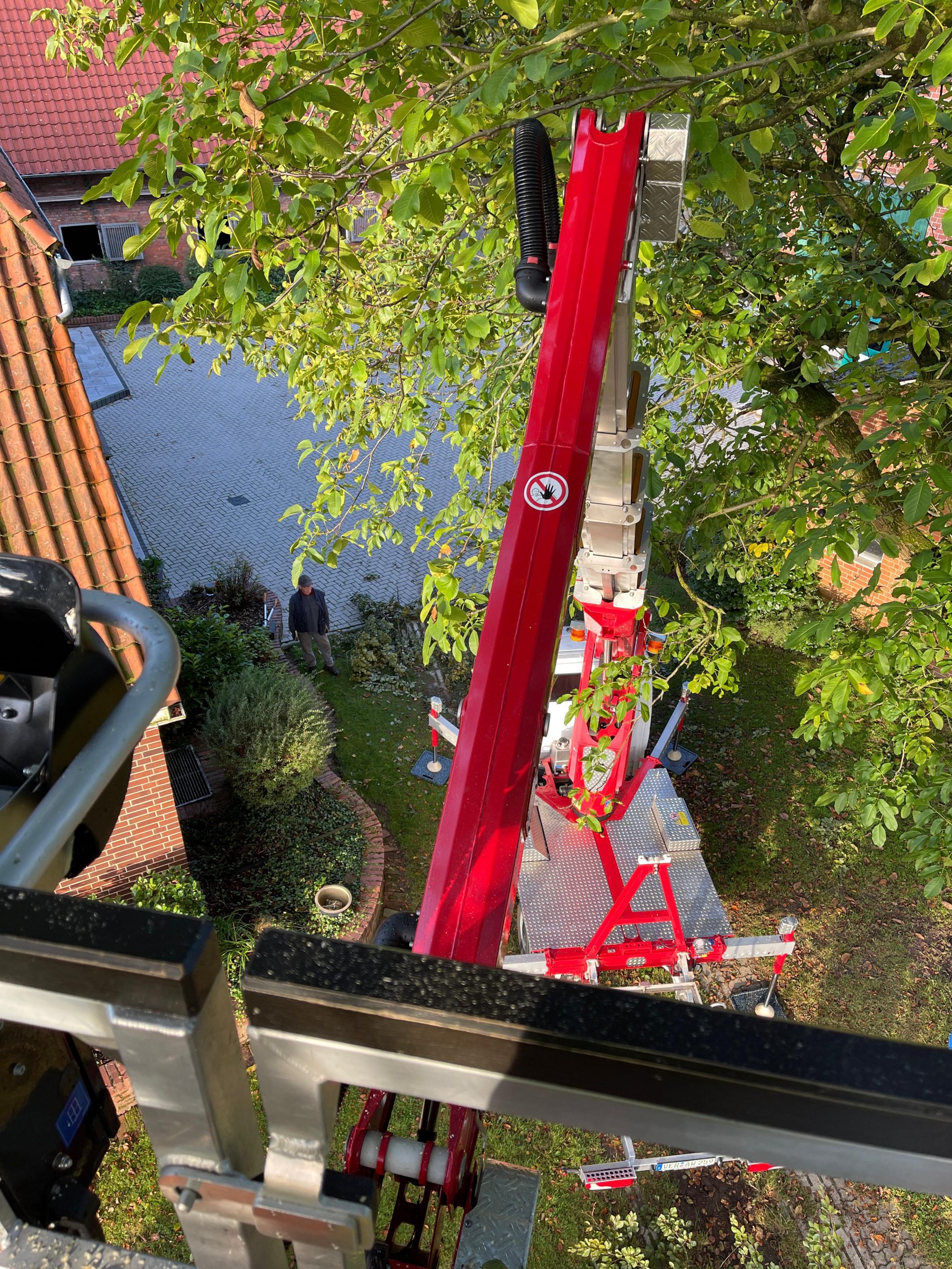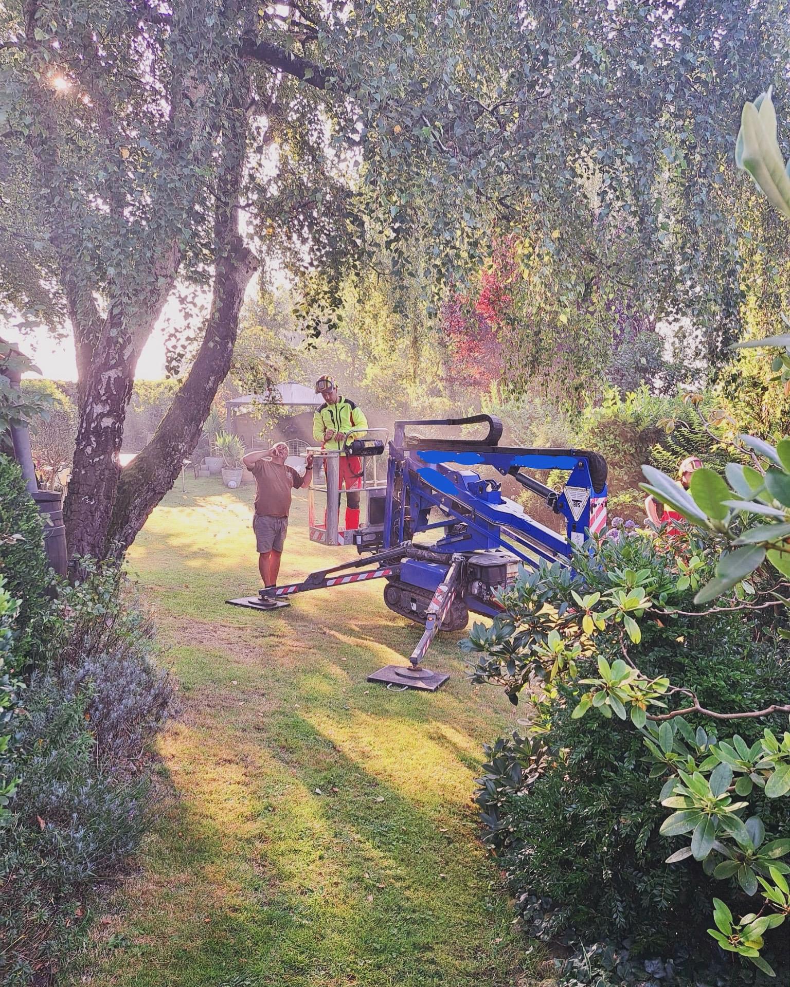 Baumfällarbeiten mit Steiger im Hintergrund