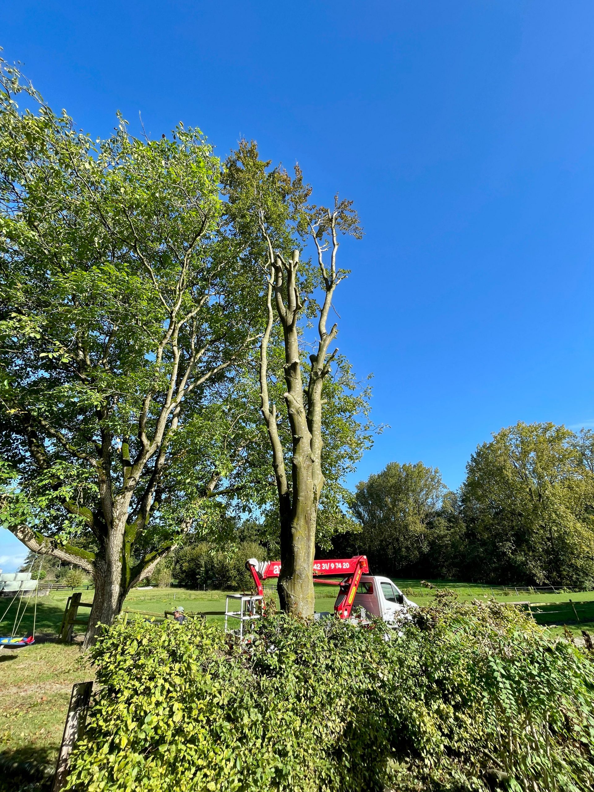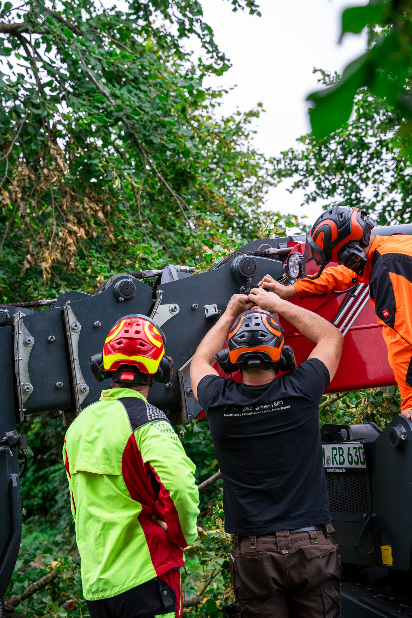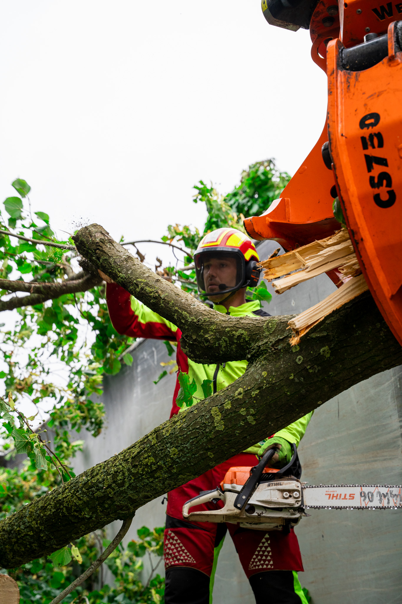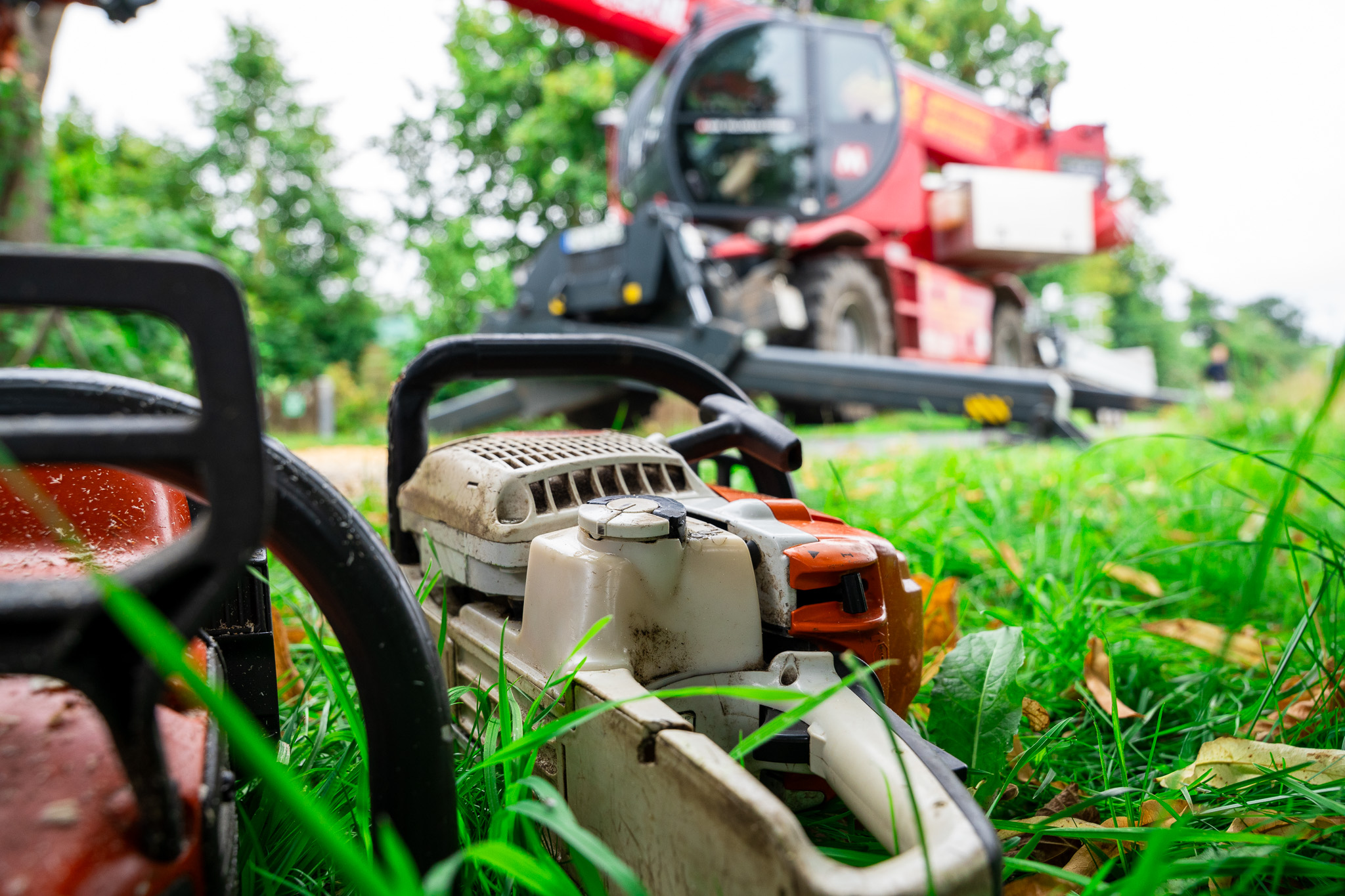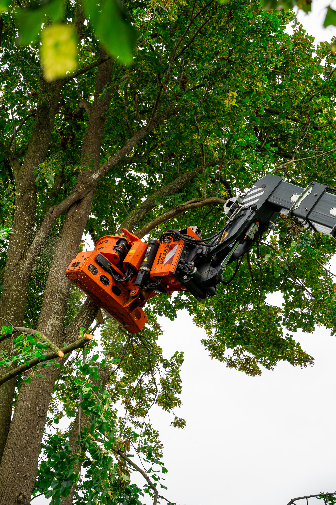 Baumfällarbeiten mit Steiger im Hintergrund