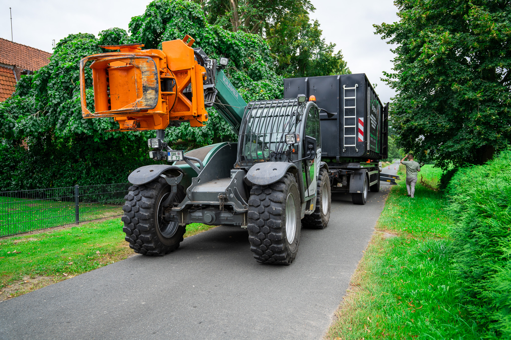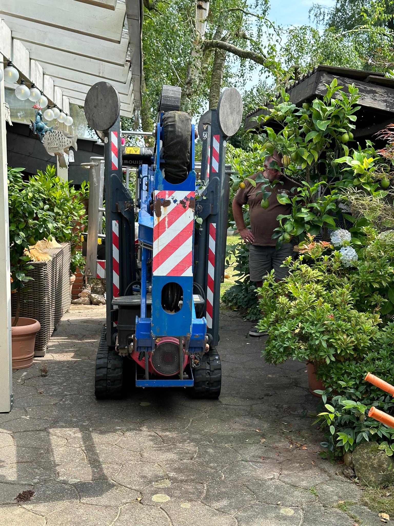 Steiger mit Kettenantrieb fährt durch Garteneinfahrt