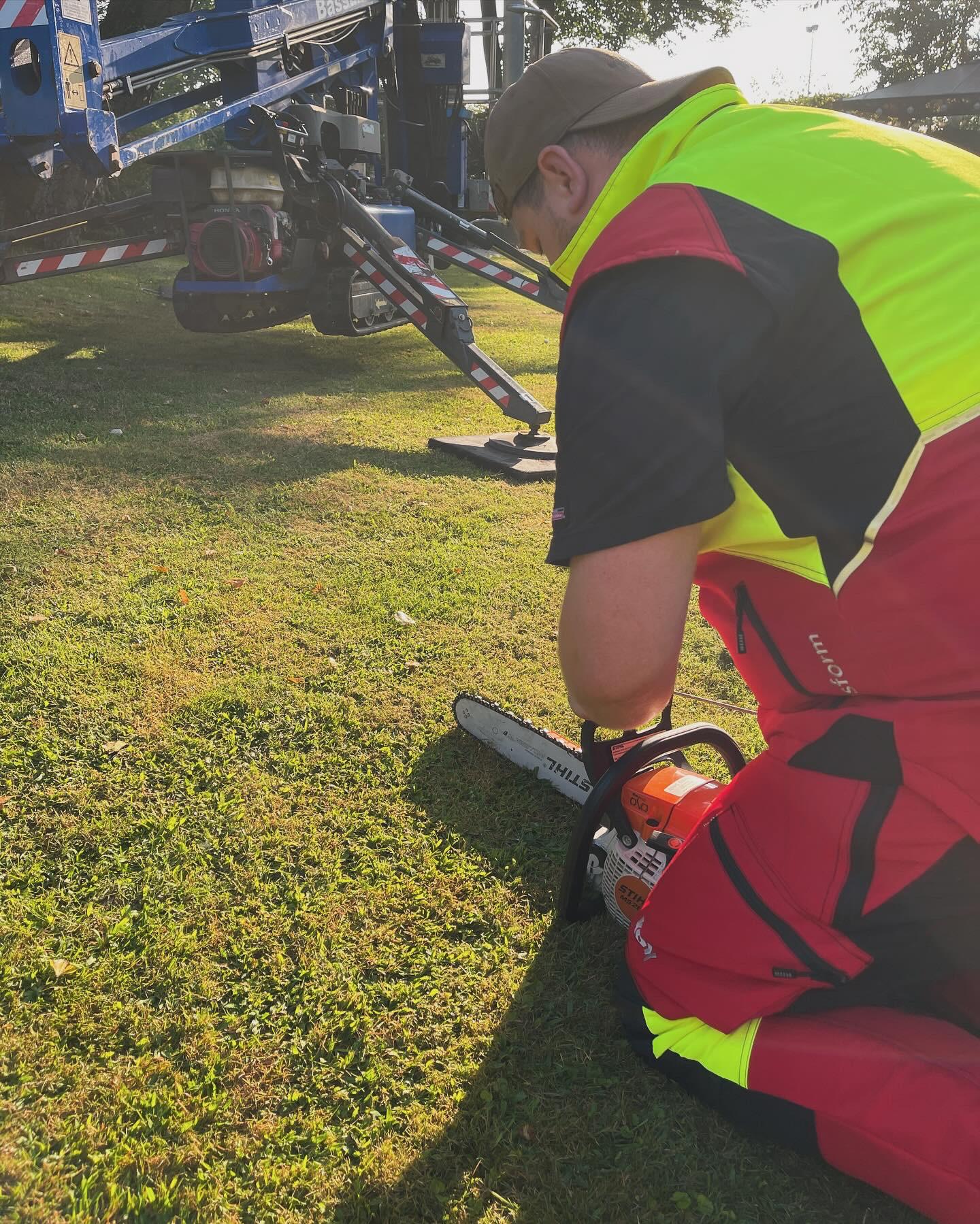 Max mit Kettensäge vor blauem Steiger