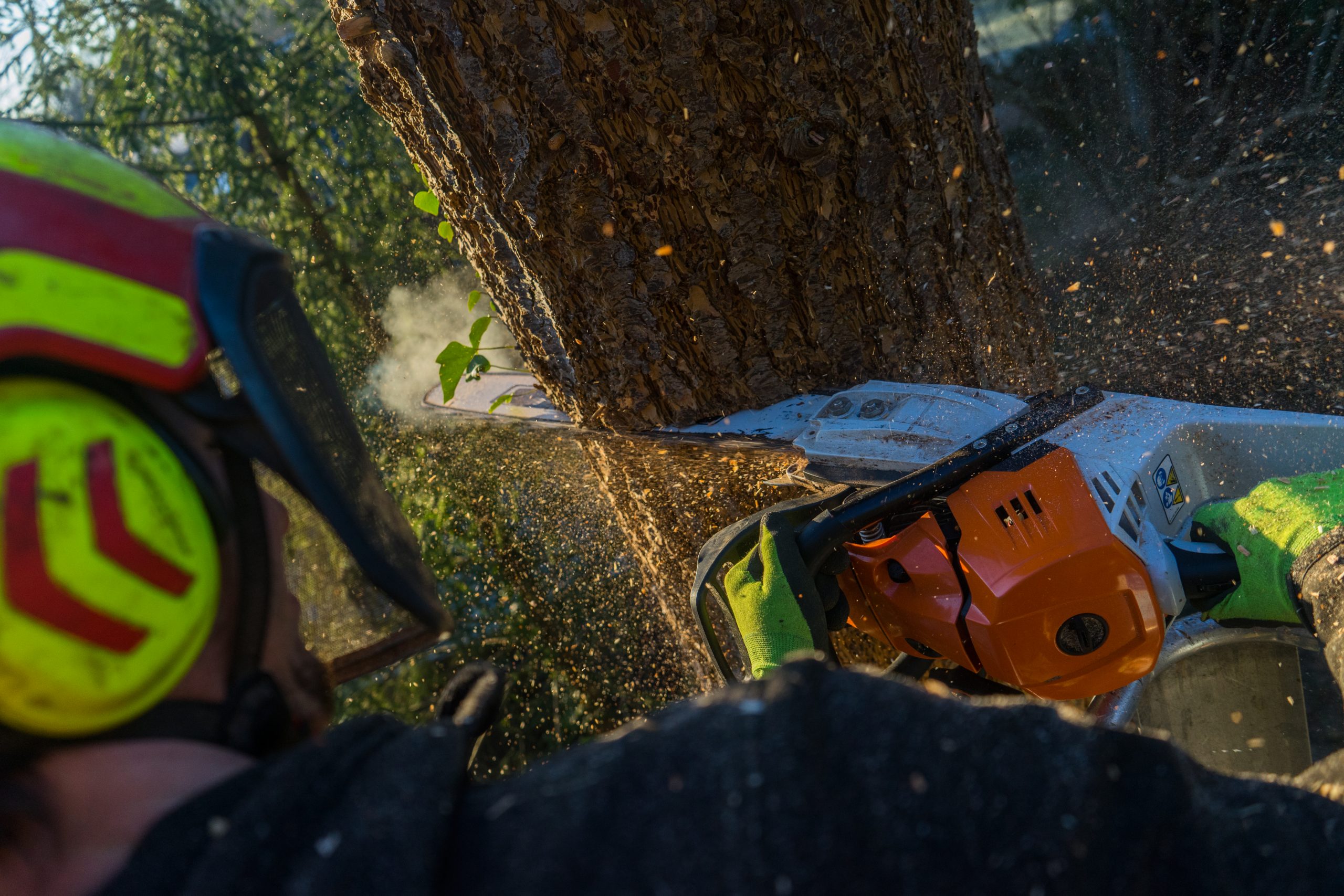 NATURA BaumService. Nahaufnahme Kettensäge fällt Baum